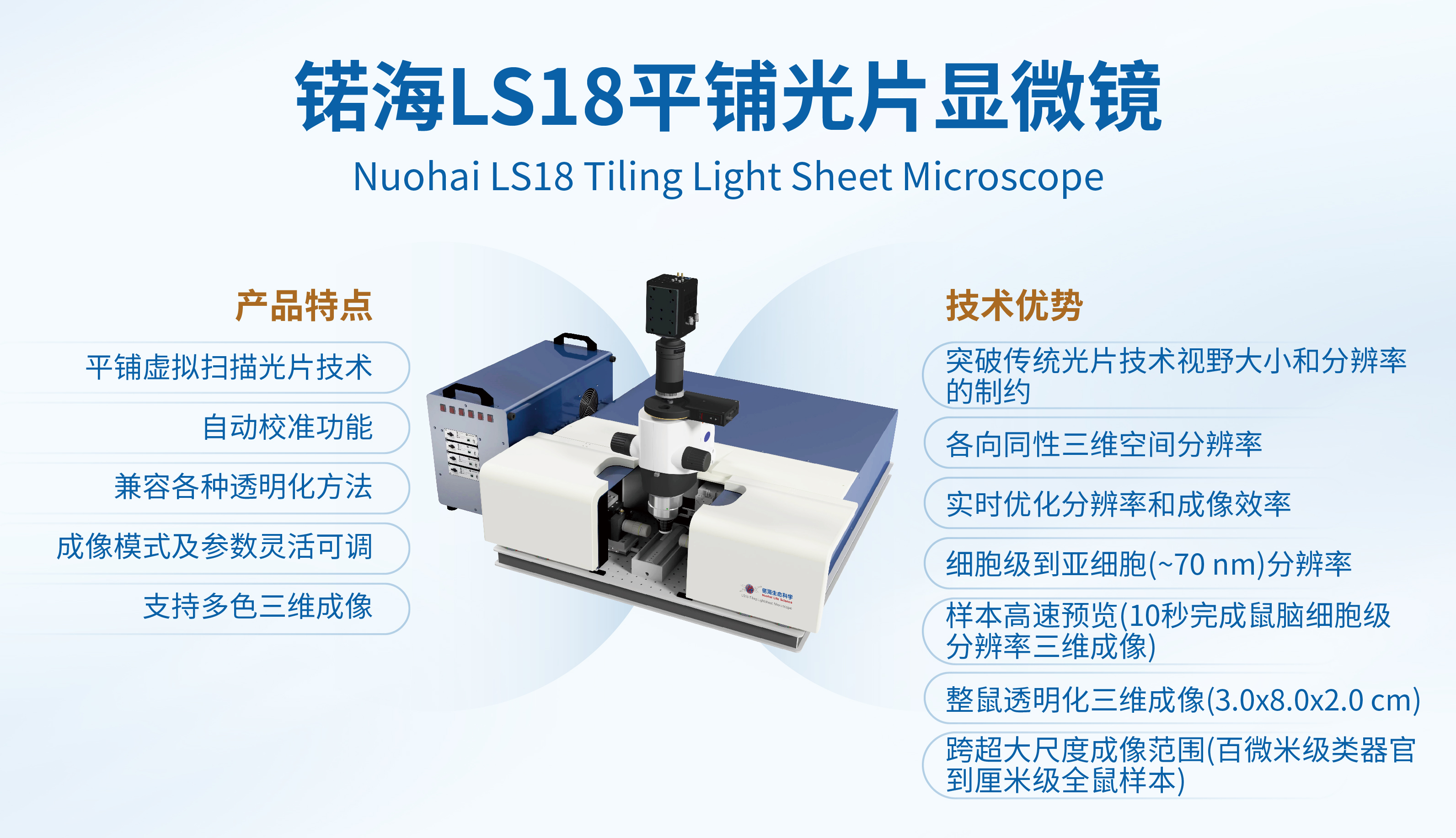 锘海LS18平鋪光片顯微鏡采用平鋪虛擬掃描光片技術(shù),克服了傳統(tǒng)光片顯微鏡中三維空間分辨率、信噪比和成像視野間的矛盾,可進行更高分辨率的三維成像。通過平鋪技術(shù)可對光片狀態(tài)進行實時調(diào)節(jié)和自動校準,保證其在不同應(yīng)用中的易用性和穩(wěn)定性。此外,根據(jù)不同樣品的特性,LS18還分別提供了優(yōu)化配件以及流程方案,方便使用者調(diào)整成像分辨率、速度、放大倍數(shù)等參數(shù)以及樣本的處理方法,以獲得微米級、亞微米級甚至百納米級三維空間分辨率的多色組織結(jié)構(gòu)信息。配套的三維圖像分析軟件和常用數(shù)據(jù)分析方案讓使用者可更高效地對結(jié)果進行分析和解讀,因此LS18被廣泛應(yīng)用于發(fā)育、腫瘤、神經(jīng)等基礎(chǔ)生物科研領(lǐng)域以及藥物開發(fā)、藥效檢測、臨床病理檢測等醫(yī)藥領(lǐng)域。