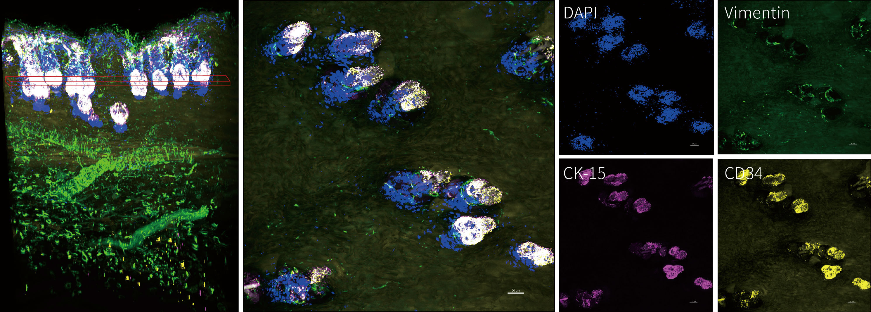 采用anti-Vimentin(綠色)、anti-CD34(黃色)、anti-CK-15(洋紅色)、DAPI(藍(lán)色)共同標(biāo)記;