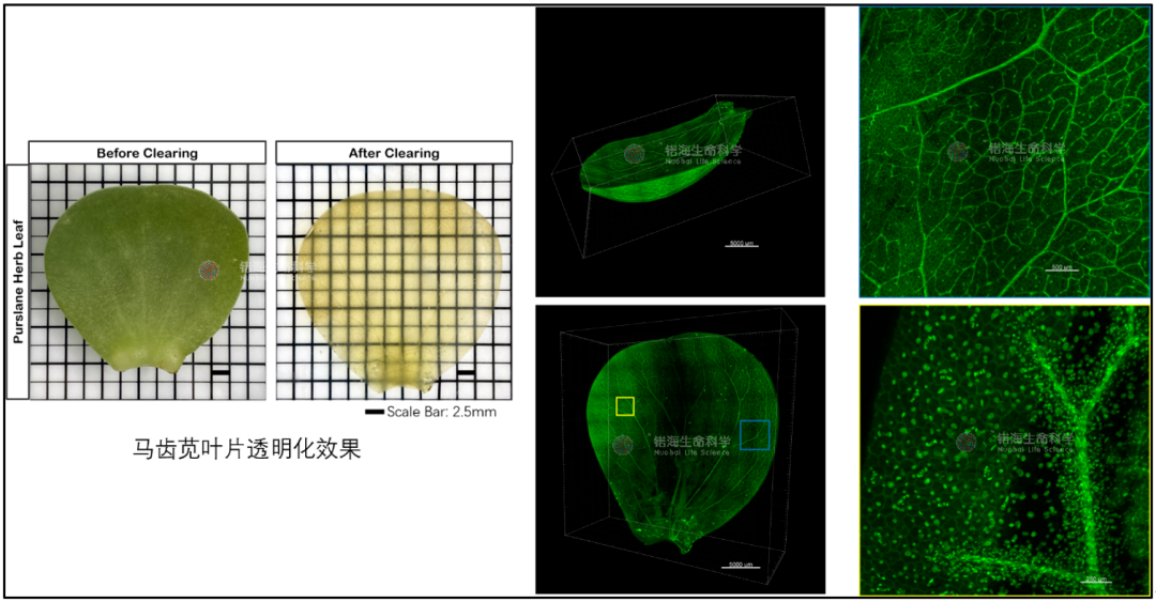 本試劑盒能夠快速實(shí)現(xiàn)整個(gè)植物器官或全身的透明化,為植物三維成像領(lǐng)域提供了一個(gè)創(chuàng)新且高效的解決方案,通過(guò)結(jié)合锘海的先進(jìn)光片成像和圖像處理技術(shù),使得對(duì)植物樣本進(jìn)行完整結(jié)構(gòu)和細(xì)胞層面分析成為可能。這一技術(shù)在推動(dòng)植物學(xué)科領(lǐng)域的研究進(jìn)展方面展現(xiàn)出巨大的潛力,為植物科學(xué)研究開辟了新的視野和可能性。